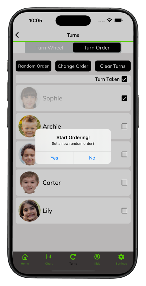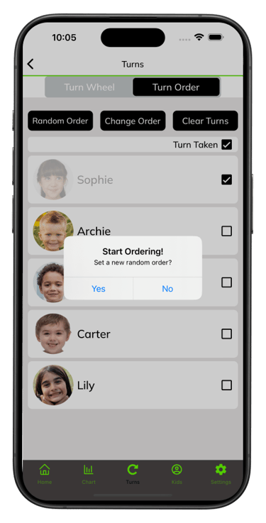Add activities for turn-taking. Create an order for each, or mix it up by selecting 'random order'. Check off each kid to keep track of who had a turn. Kid Turns focuses on just the turn-taking features.